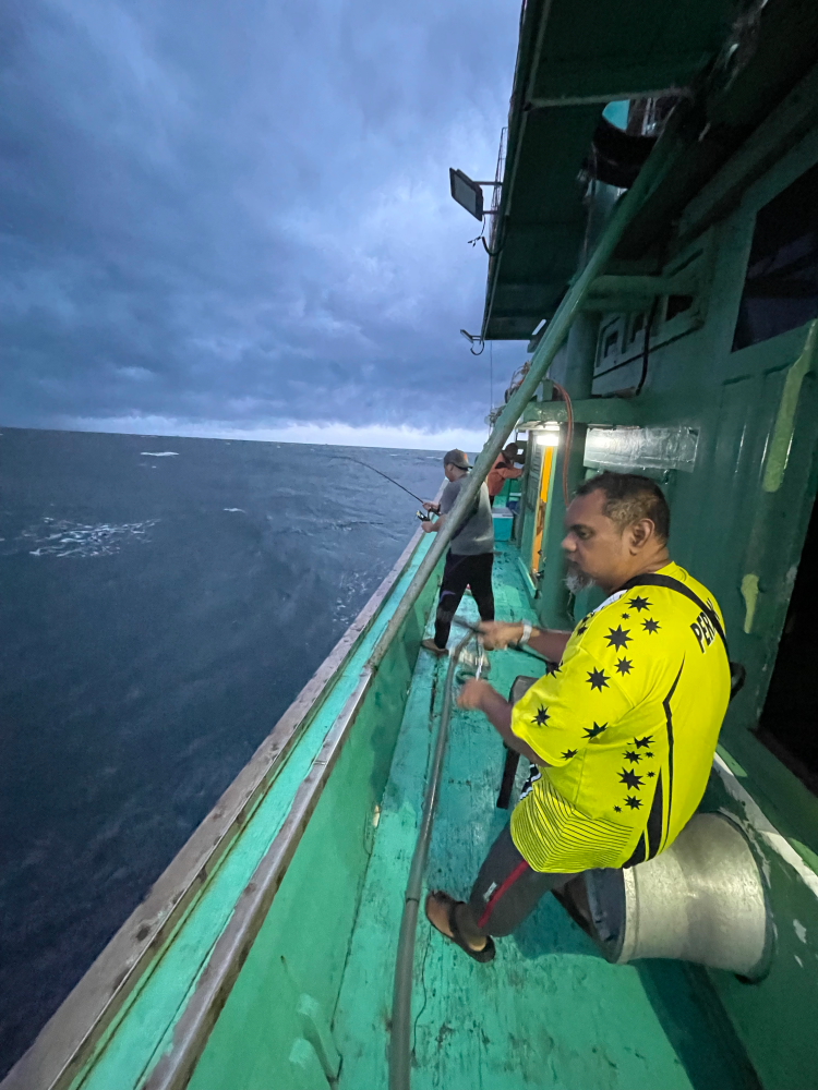2hb, bangun suboh.. lepak jap.. pkul7 kuar p sarapan..  kami makan kt simpang luar sebelah masjid.. lepas balik.. miedodol, arip dgn daus nk mancing pantai.. geng mieIT lak sampai subuh tadi.. dia mancing pantai.. depa nk joint sekali.. p layan jap.. pkul830 sampai 9lebih.. paneh kow.. aku lepak baring bawah pokok.. ada hamok org kampung.. pkul10 chow.. sambil lepak, ada ikan bolos depa dapat.. layan goreng..  pkul gerak p lunch.. layan lak siakap goreng sg kerak.. abih kena rm21 sorang.. balik sambung baring.. berpaneh area umah ni.. xleh nk lelap.. pkul4 kami dah bersiap.. kasi kemas umah.. terus gerak ke jeti.. bleh salah jeti lak.. bot nelayan tempat lain.. gerak ke sana.. duk menunggu geng lain.. katanya pkul5 dah naik bot.. hmm.. hafiz & geng baru sampai.. .. kami naik bot kecik nk bot nelayan.. baru satu trip.. ujan dh turun.. tunggu jap.. gerak ke bot besar, xleh nk bertolak laie pasal ikwan dgn ayah dia xsampai laie.. nunggu 5minit.. bila semua dah ada.. pkul540 baru gerak.. ke spot candat.. otw dah nampak sebelah dataran bergelap gelita.. dlm sejam berjalan.. depa parking bot.. 658 ribut mula sampai kat kami.. alaaa.. yg hadkor, turun mancing dah.. cungkil apa ada.. bila mula langit menitik, duk nengok bumbung depan ni bleh bocor lak.. p cari port belakang.. berbuai agak kuat.. lari p lepak kt sebelah dapor.. macam okey.. aku berdiri je sini.. mengelak baju basah.. berjam gak ujan nk berhenti.. kejap ujan kejap reda.. dah maleh rasanya aku nk pasang pancing.. lepak borak je lah dgn mieIT.. kekejap aku merayau keluar.. pkul8 bonjai geng 1st dapat sotong.. kemudian ajoi.. masa ni memasing ada ler hasil naik.. tapi kurang galak lah.. aku memang sambung duduk kt area dapor je lah.. pkul10 makan mlm lauk nasi+kari ayam.. paneh sikit badan ni.. baju lak agak lembab dan xbasah.. pkul11 dah cari port gantung hamok.. aku selit kt tiang depan bot.. bole gantung.. pakai baju sejuk baru selesa nk lelap..