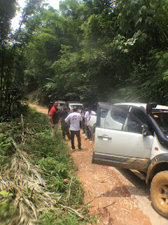 D01: pkul6 terjaga, mandi bersiap.. luar ujan lebat lak.. tunggu dlm 15mnit, aku redah naik moto terus ke uluyam.. pkul8 sampai, parking moto umah wakleh.. loading dlm powil.. kami 2powil gerak p sarap kt area simpang kg nakhoda.. gerak masuk hiway-bentung-raub-cheroh-tersang-pkul1030 sg.koyan, lepak minum..ada empat powil.. gerak masuk laluan ke betau - ke kiri, kg asli.. route separa tar.. dlm tiga jam.. duk mencari port nk tido.. kebanyakan laluan sunggai bertebing tinggi.. last mereka parking kt cabang jalan antara lenjang-titom.. aku bersiap, gerak p cast kejap.. mau tengok port.. kosong, balik.. buat port tido gantung hamok antara tiang signboard.. boleh ler buat lelap mlm ni.. chef wakleh lakibini masak mlm ni.. ada yg membottom mlm, aku layan sembang dan baring..